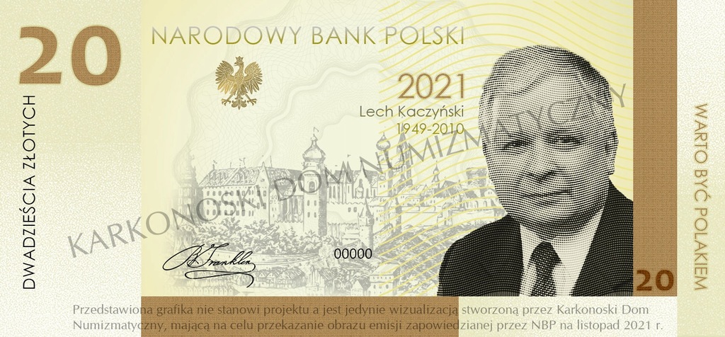 Banknot kolekcjonerski z byłym prezydentem RP Lechem Kaczyńskim ma trafić do obiegu w listopadzie. Narodowy Bank Polski zamierza wyemitować banknot kolekcjonerski o nominale 20 zł z podobizną zmarłego tragicznie prezydenta Lecha Kaczyńskiego. W sobotę 10 kwietnia prezes NBP Adam Glapiński podpisał wzór banknotu kolekcjonerskiego z wizerunkiem prezydenta Lecha Kaczyńskiego.